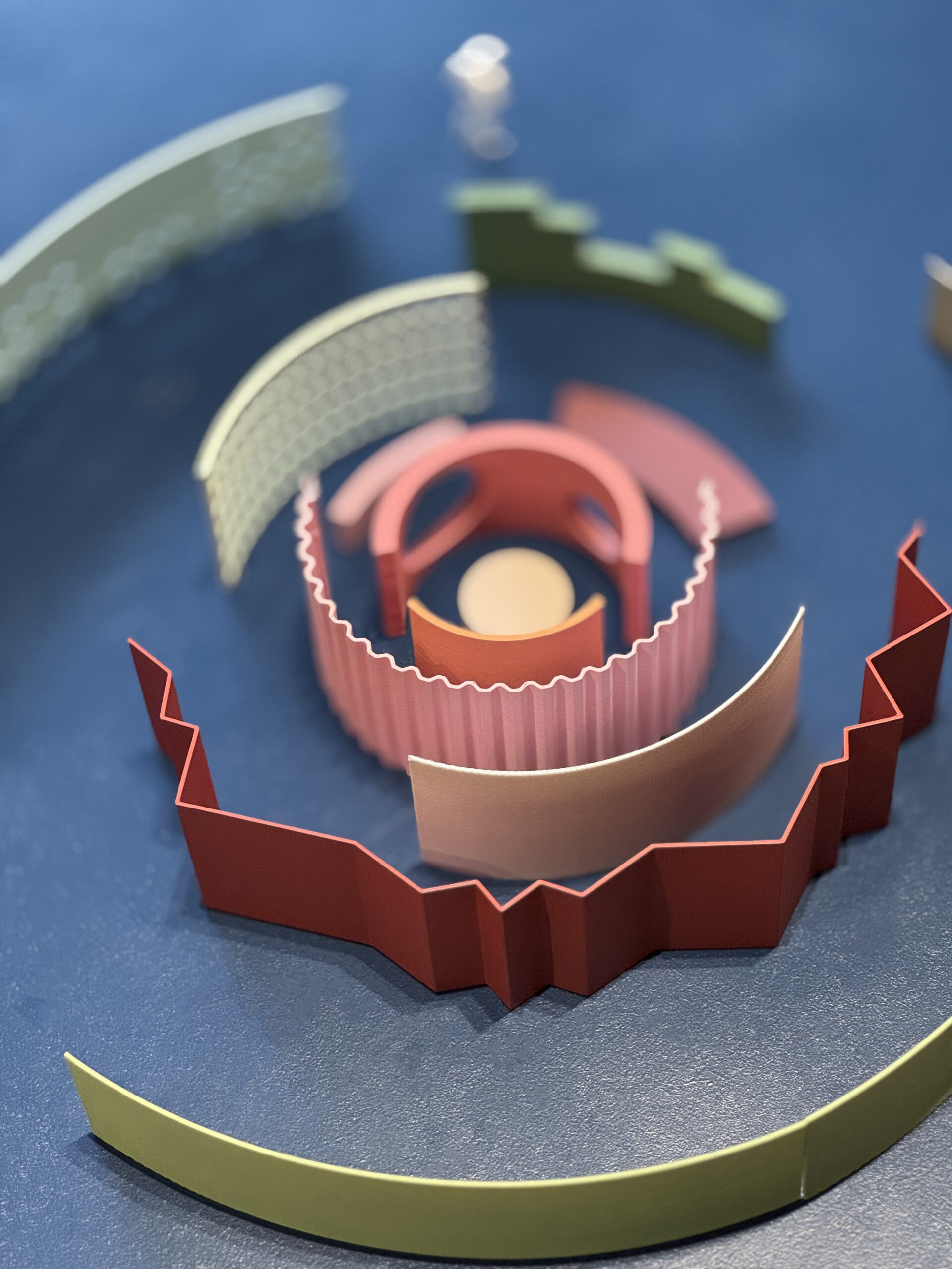 Jedes Modell zeigt eine andere Strategie der räumlichen Installation: von spiralförmigen Strukturen, die Plätze neu definieren, bis hin zu fragmentierten Architekturen, die zwischen bestehenden Gebäuden vermitteln. Die bewusste Farbgebung – Grün für Vegetation und Aufenthalt, Rot für Bewegung und Aktivierung, Rosa für weichere Übergänge – macht verschiedene Funktionsebenen sichtbar und schafft eine lesbare Grammatik des öffentlichen Raums.