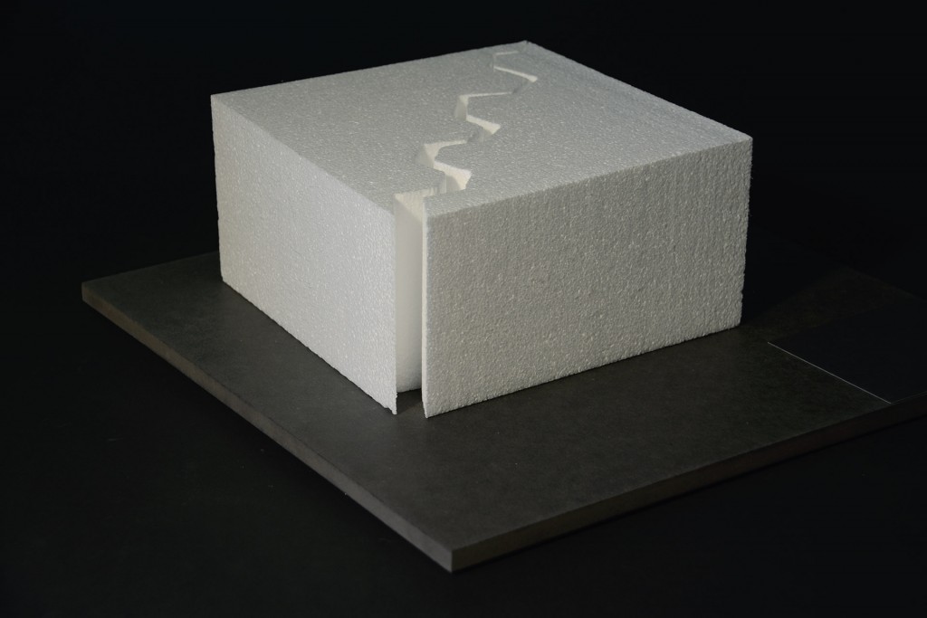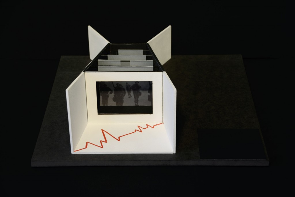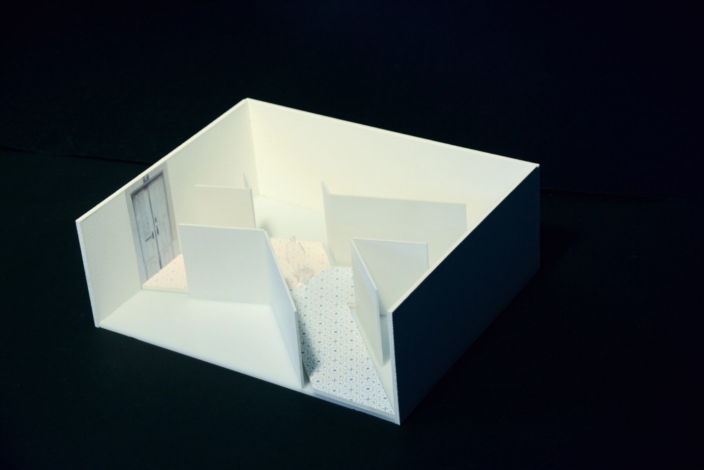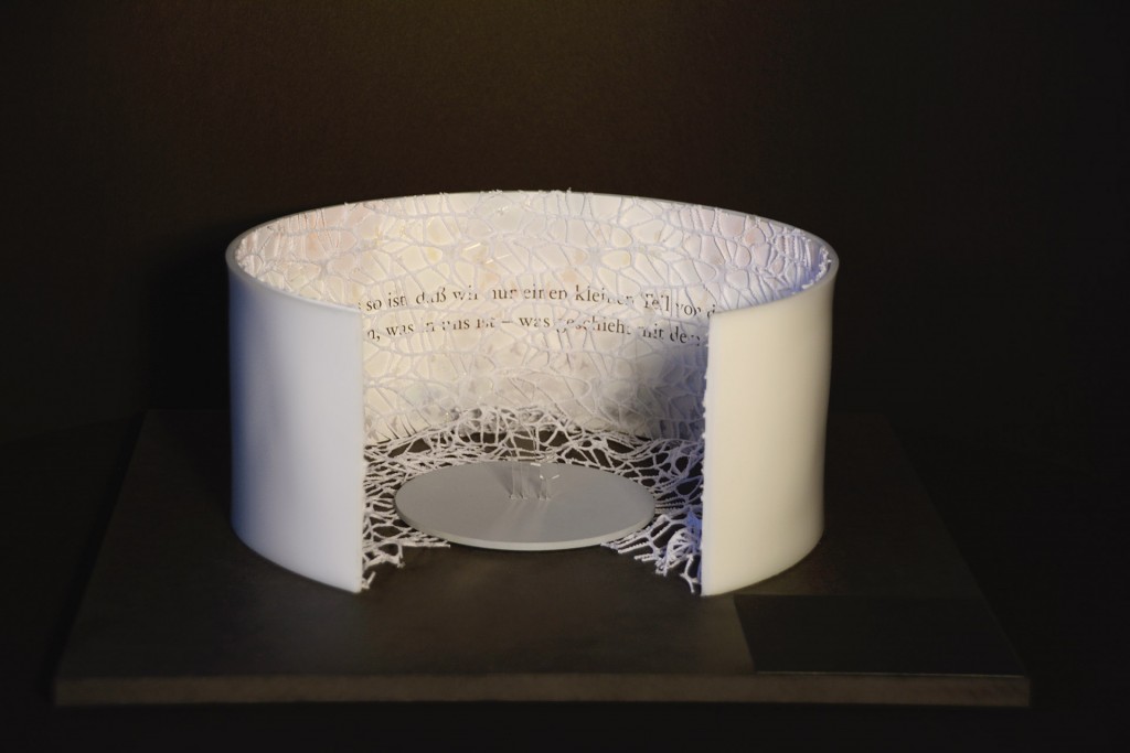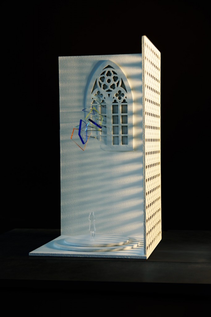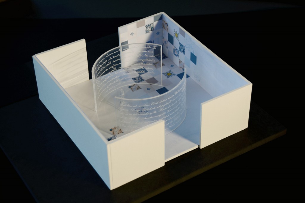 Der durch seine Höhe sakral anmutende Raum ist in weiße Farbe getaucht. Diese symbolisiert die Unnahbarkeit der Vergangenheit. Elemente der Raumbeschreibung aus dem Buch finden sich in abgewandelter Form wieder. Ein Relief eines Gotikfensters, das optisch auf einer Seite abnimmt und in die Wand übergeht, zeichnet die Spuren der Vergänglichkeit ab. Eine Glasscherbeninstallation, die eine Momentaufnahme eines zerspringenden Fensters zeigt, unterstützt diese Aussage. In der Mitte des Raumes, auf einem Plateau, kann der Rezipient auf einem Sitzmöbel die Rede von Prado entweder lesen oder über eine Medienstation anhören. Dort befinden sich auch herausnehmbare Acrylglaslinsen, die der Besucher in die Hand nehmen und den Raum bzw. die Glasscherbeninstallation durch einen anderen Blickwinkel betrachten kann. Der versetzte Blick greift die Thematik des Wiederkehrens bzw. das Aufsuchen eines besonderen Ortes in einer anderen Zeit auf. Zwei Raumwände sind mit einer Struktur versehen, die sich auf dem Boden des Raumes durch eine Hinterleuchtung abzeichnet. Die Struktur greift ein Formelement des Gotikfensters auf.